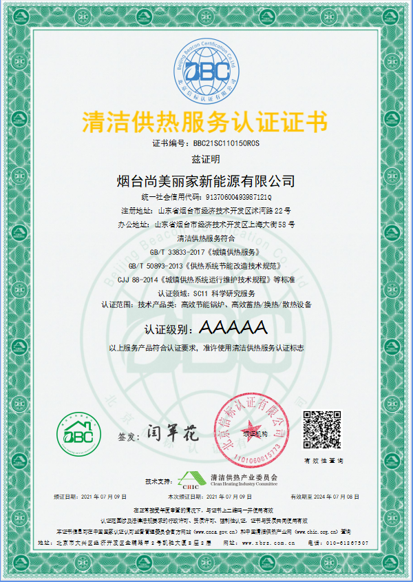 2021年7月9日,烟台尚美丽家新能源有限公司凭借卓越的高效节能锅炉、高效蓄热/换热/散热设备,荣获清洁供热服务认证5A证书。