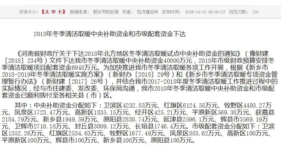 2018年12月12日,新乡市财政局发布消息,按照《河南省财政厅关于下达2018年北方地区冬季清洁取暖试点中央补助资金的通知》(豫财建〔2018〕234号)文件内容,2018年新乡市获得了冬季清洁取暖中央补助资金40000万元,市级财政预算安排冬季清洁取暖项目配套资金6948万元。新乡市2018年冬季清洁取暖中央补助资金和市级配套资金顺利拨付至下辖的各相关县(市)区。