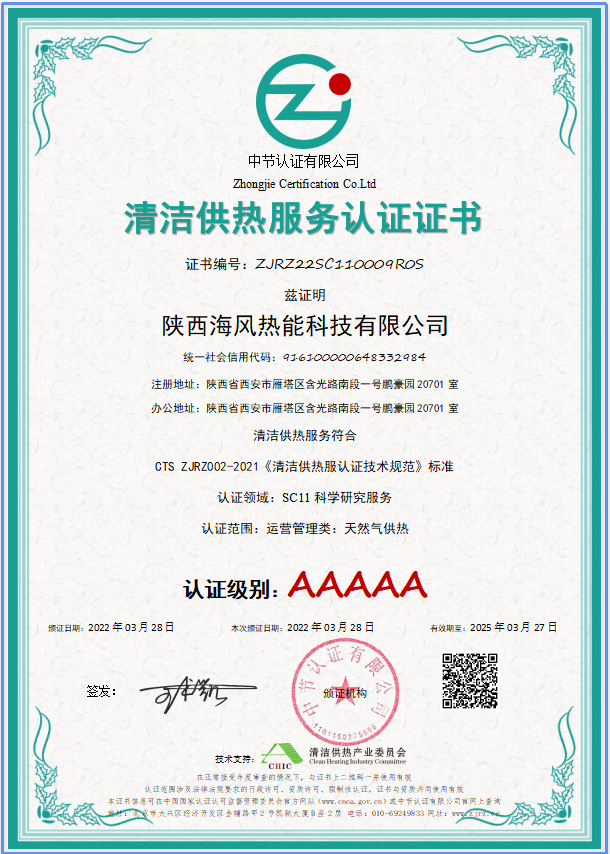 2022年3月28日,海风热能凭借卓越的天然气供热项目运营管理荣获清洁供热服务5A证书。